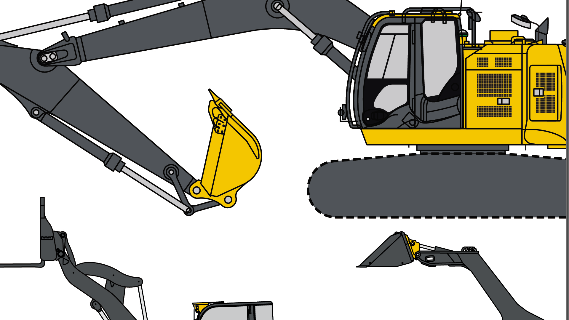 Lot of excavators in scalable vector format - ai, svg, dxf, eps and png